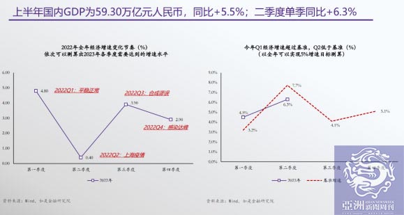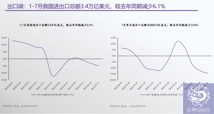 去年12月初疫情防控政策进行调整,正好在春节前那段时间出行恢复,大家都充满信心,很多企业家都讲,我们要把过去失去的3年补回来,信心非常足。所以股票市场大涨,餐饮、旅游什么的都恢复得很好。春节之后又到两会前后,针对疫情之后的恢复等,大家想听一听新的想法,那时候可以说是喜气洋洋,三四月份的情况确实也还不错,除了餐饮、旅游,房地产恢复得也很好。当时有两个标志性的城市,成都和济南,成交量价格都上亿了。那时候我们非常关注高频数据,甚至周度数据,因为这是疫情防控政策调整以后的头一年,我们也不是很清楚未来会怎样发展。当时有两种说法,一种是认为我们能慢慢恢复,另一种认为可能没那么容易,因为还有所谓的疤痕效应,它不仅仅对资产和经营有影响,还对人的心理有影响。同时出口三四月份表现也不错,因为一二月份相对来讲表现不好,但是三四月份大家的体感差距就很大。一方面很多出口外贸企业感觉非常冷,另一方面出口数据又表现比较好。